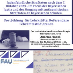 Als Fortbildung für Lehrkräfte, Referendare und Studierende lädt der Lehrstuhl für Geschichtsdidaktik den zentralen Antisemitismusbeauftragten der Bayerischen Justiz, Oberstaatsanwalt Andreas Franck, zu einem Vortrag ein.
